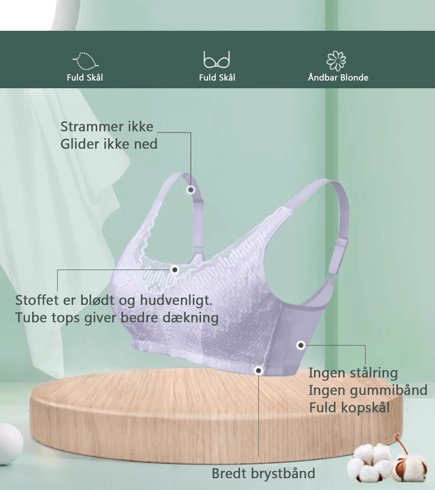 - Kop foring: 84,6% Modal - 9,4% Silke | 6% spandex